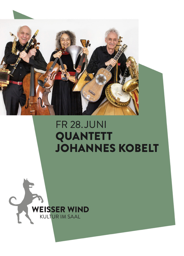 Ob die Musiker diesmal auf die Bühne passen? Unvergessen ist der letzte Auftritt im Weissen Wind, als das Quantett Johannes Kobelt an der langen Seitenwand des Saals auftrat, damit das Publikum den besten Blick auf die historischen, seltenen und teils kuriosen Instrumenten aus fünf Jahrhunderten geniessen konnte. Auf jeden Fall dürfen wir uns diesmal auf das Jubiläums-Programm "Quantettologie" zum 45-jährigen Bestehen der unkonventionellen Musikantentruppe von Katharina und Johannes Kobelt sowie Adrian Bodmer freuen. Die Wurzeln ihrer Kompositionen sind in der Klassik, im alten Jazz, in der Ziegeunermusik zu finden. Das Quantett nimmt uns mit auf eine humorvolle Reise in ganz unterschiedliche Musikkulturen - in das Bachland, das Paprikaland, das Käseland, das Balalaikaland und das Jazzland.