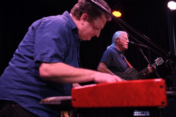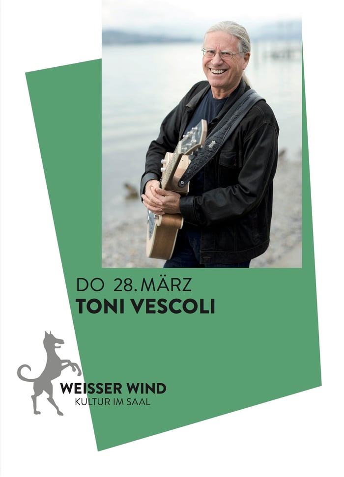 Toni Vescoli braucht man eigentlich nicht mehr vorzustellen: Der "Schweizer Beatle" und "Les Sauterel-les"-Rocker ist nun schon seit über fünfzig Jahren on the road. Im Weissen Wind können wir Vescoli für einmal in intimerem Rahmen als üblich kennenlernen: mit unverwechselbarer Stimme, zupfend, schlagend und slidend auf seinen verschiedenen akustischen, elektrischen und blechernen Gitarren, örgelnd mit seiner "Schnurregyge". Mit dem Stiefelabsatz spielt er dazu noch Pauke und Tamburin. Sein Duo-Partner Markus Maggi begleitet Vescoli virtuos am Akkordeon, den Keys und singt gefühlvoll die zweite Stimme. Eine Zwei-Mann-Big-Band!