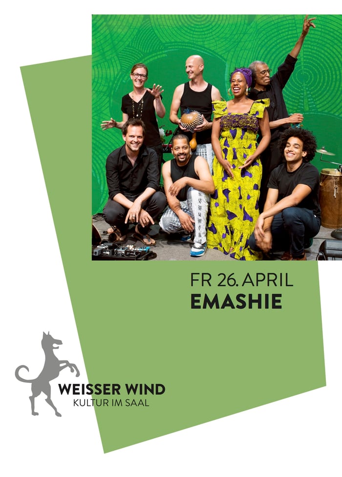 Dank ihrer Freienwiler und Ehrendinger Musiker bestreiten Emashie schon fast ein Heimspiel im Weissen Wind. Wir freuen uns, den Afro-Soul der Multikultiband endlich auf der Bühne im Saal zu sehen. Seit 1999 schöpft die Band aus ihrem multikulturellen Background und mischt Stile wie Funk, Soul, Afro und Latin zu einem eigenständigen Sound. Die Musiker verzaubern ihr Publikum mit einer Fülle von exotischen Instrumenten und nehmen es mit in eine Welt voller Rhythmus und Melodien. Farbenfrohe, gefühlvolle Musik, die unter die Haut und in die Hüften geht! «Emashie» ist übrigens ein ghanaisches Wort, ein Ausdruck der Freude, der dann verwendet wird, wenn das Essen besonders gut schmeckt – oder Ghanas Fussball-Nati den Gegner weggefegt hat.
