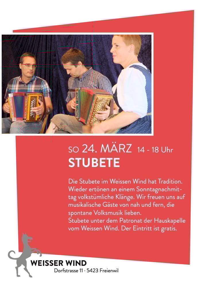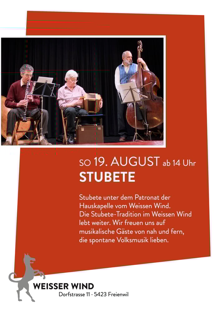Ende August ists so weit: Im Saal des Weissen Windes ertönen an der Stubete wieder volkstümliche Klänge. Wir freuen uns am Sonntagnachmittag auf musikalische Gäste von nah und fern im traditionellen Lokal, das als "Bestatter-Beiz" in der SRF-Serie mit Mike Müller weitherum bekannt wurde. Unter dem Patronat der Hauskapelle des Weissen Windes gibts spontane Volksmusik in allen Variationen zu hören. Jung und Alt sind eingeladen, mit ihren Instrumenten teilzunehmen. Die Stubete ist übrigens der Abschluss eines volksmusikalischen Weekends: Am Abend zuvor stellt Karin Streule mit ihrer Band im Saal ihre Version von Schweizer Volksmusik vor.